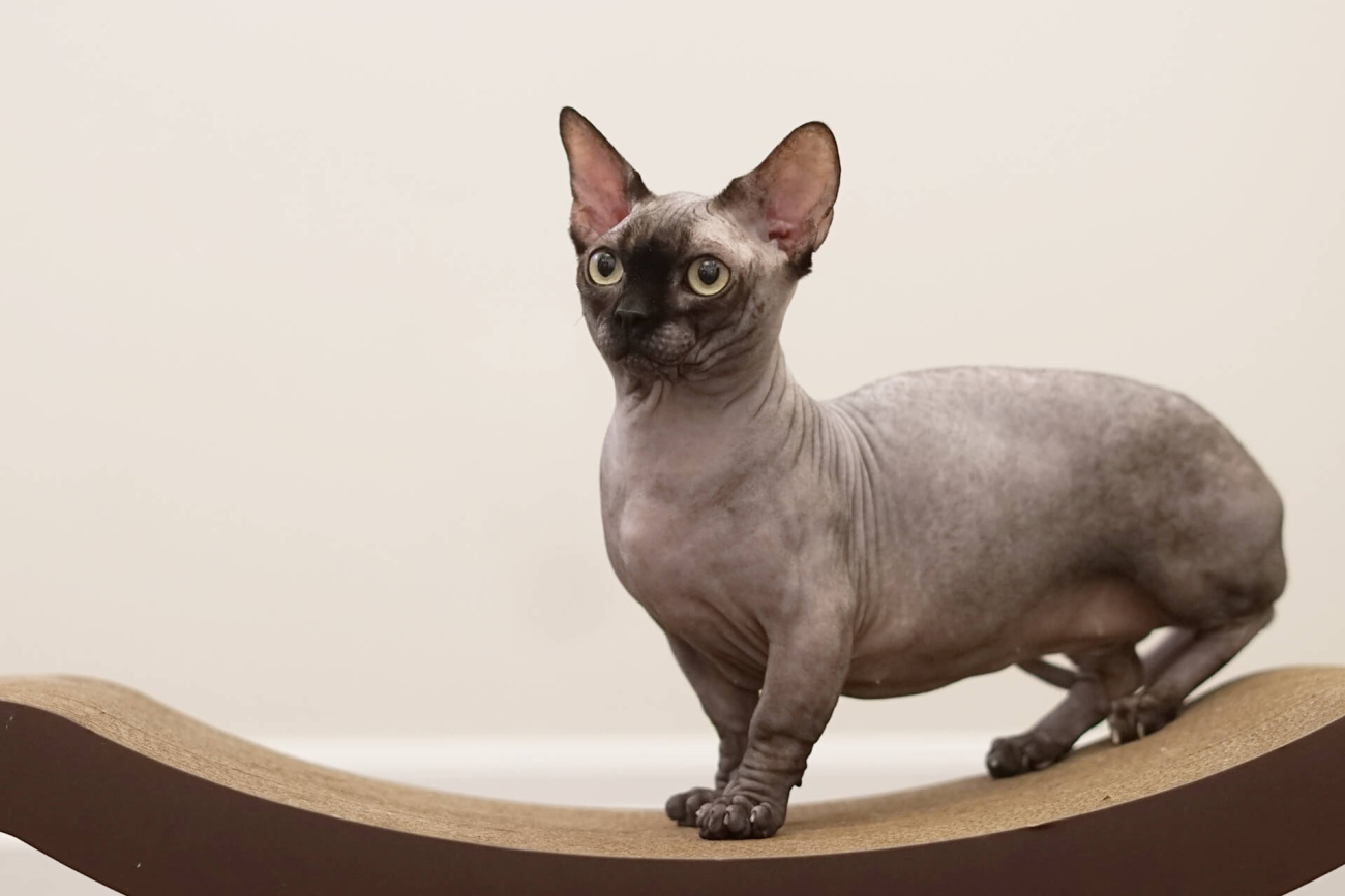 The Sphynx is one of a few hairless breeds. Striking and distinctive in appearance, they do not lack hair entirely. Fine down covers the skin of most Sphynx, giving the skin a chamois or suede-like texture.